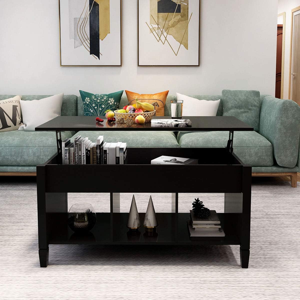 A lower open shelf is included in the lift top coffee table for additional display space and can even hold small organizing bins for hideaway storing options.